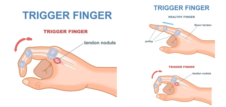 방아쇠증후근은 손가락 힘줄에 염증이 생기면서 힘줄이 굵어지고 움직일 때 걸리는 현상이에요. 마치 방아쇠를 당기듯 손가락이 딱 걸리는 느낌이 들어서 이름이 붙었답니다.